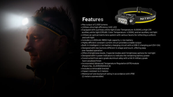 Челникът Nitecore HC65 UHE разполага с 8-ядрен UHE LED и 8-ядрена UHE матрична оптична система, като 8-ядрената му архитектура оптимизира както производителността, така и консумацията на енергия. Неговата усъвършенствана матрична оптика постига над 94% ефективност на пропускане на светлина и отразяваща повърхност от 509 mm², което значително минимизира загубата на светлина при проекция и подобрява ефективността на отражение, като по този начин ефективно увеличава разстоянието на лъча. Предлагайки пикова мощност от 2000 лумена и разстояние на лъча от 222 метра, той отговаря на взискателните изисквания за производителност, изисквани от челници в различни среди. За разлика от едноядрения точков източник на светлина в HC65 V2, HC65 UHE разполага с повърхностен източник на светлина с ширина 42 мм, около 2,5 пъти по-широк от предшественика си. Тази ширина, по-близка до междузеничното разстояние на човешкото око, подобрява възприятието на осветените обекти, правейки ги да изглеждат по-триизмерни и естествени с по-ясни и прозрачни контури, като по този начин подобрява безопасността на открито. Първият в индустрията, този професионален челник се предлага стандартно с високопроизводителна 4000mAh 18650 литиево-йонна батерия (NL1840HP), осигуряваща около 17,6% по-голям капацитет от типичните 3400mAh литиево-йонни батерии. С 400 лумена (ВИСОКА мощност), той може да свети до 14 часа, отговаряйки на нуждите за целодневна нощна светлина. Издръжливата външна част на челника е изработена изцяло от метал. Здравата му конструкция и фино скосените ръбове напомнят за здравината на офроуд превозни средства. Освен външния си вид, HC65 UHE се отличава с IP68 устойчивост на прах и вода, вътрешна водоустойчивост за интерфейсите (позволяваща водоустойчиво зареждане), защитен капак против сблъсък и дизайн, устойчив на падане от 2 метра, здраво оборудван, за да устои на прах, вода и неочаквани падания на открито. Освен това, дизайнът на HC65 UHE с близо до центъра на тежестта значително облекчава натиска върху челото. Той е снабден с широка, удобна лента за челника и издръжлив калъф за носене.