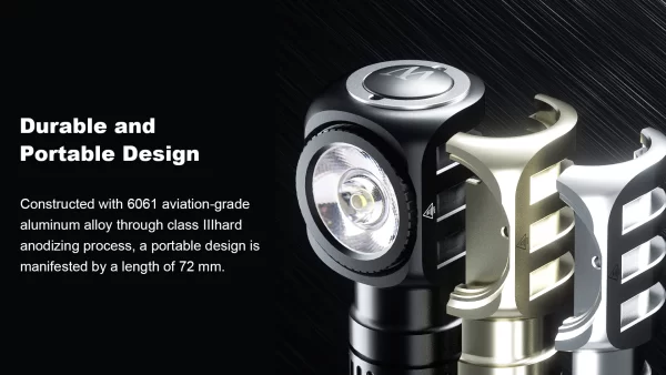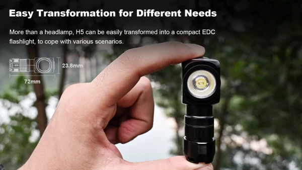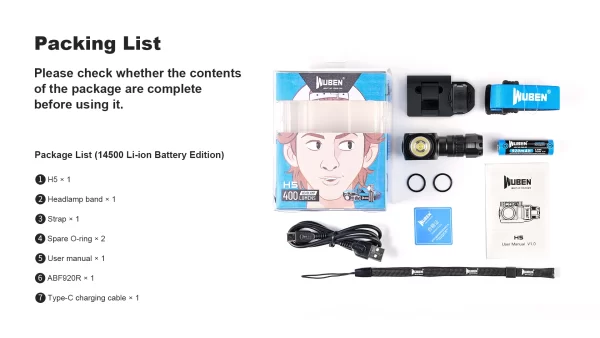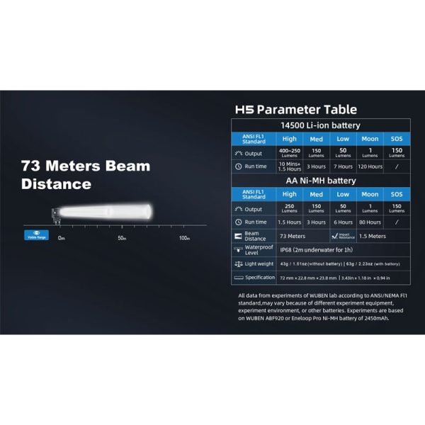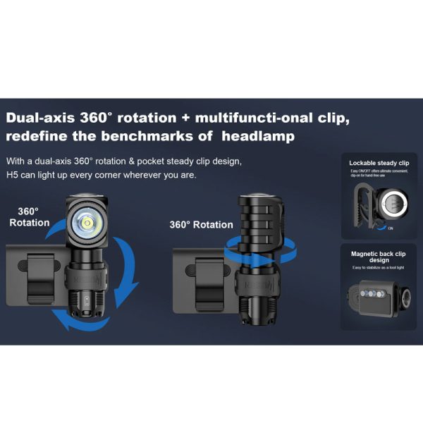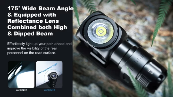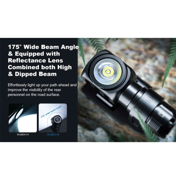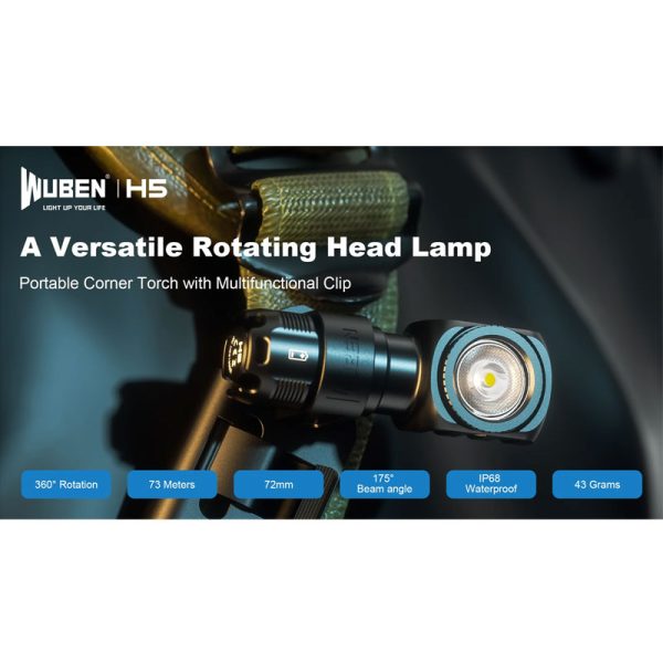 Челникът Wuben H5 400 Лумена е компактен и достатъчно ярък за ежедневна употреба. Съгъл на лъча от 175 градуса и завъртане на светлината на 360 градуса. Оборудван със светодиод OSRAM P9 LED, 5 светлинни режима HIGHT, MED, LOW, MOON, SOS. Фенерчето е изработено от авиационна алуминиева сплав 6061, устойчива на надраскване и падане. Магнитната опашка за свободни ръце може да се прикрепи към всеки железен предмет, захранва се от АA батерия или 14500 литиево-йонна батерия.