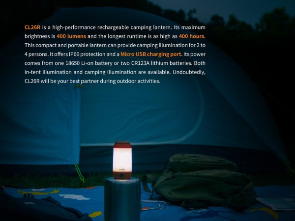 Kъмпинг лампата Fenix CL26R 400 Лумена RECHARGEABLE LANTERN е многопосочен, лек къмпинг фенер. Захранван от акумулаторна батерия 18650, този фенер осигурява максимална мощност от 400 лумена, достатъчно светлина за осветяване на целия ви къмпинг. Уникална характеристика на фенера са многопосочните режими на осветяване, три нива на яркост на 360° светлина, предна светлина и две нива на яркост на долна светлина. Уникалното разпределение на топлината позволява изключителна студена производителност. Акумулаторният фенер Fenix CL26R е изключително издръжлив и устойчив на дъжд, което прави този фенер перфектен спътник в лагера.