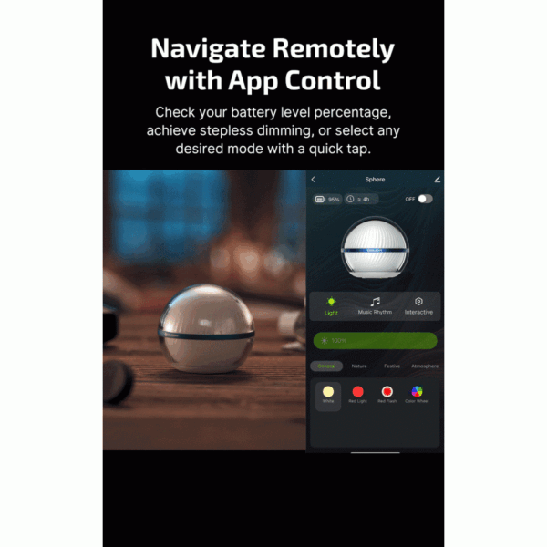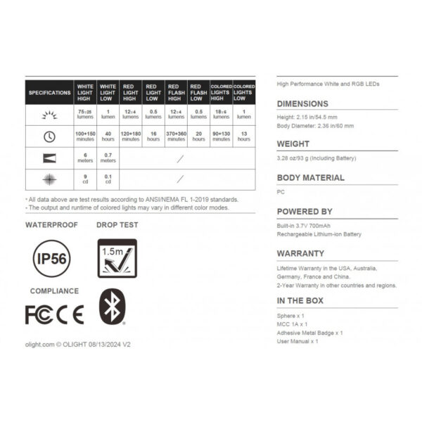Новата къмпинг лампа Olight Sphere работи като нощна лампа или къмпинг светлина, която може да се използва със или без приложението. Новата прозрачна обвивка създава усещане за дълбочина, докато „дизайнът сфера“ осигурява 360-градусово излъчване на светлината. Със 7 достъпни режима с помоща на превключвателя и 20 светлинни ефекта, управлявани от приложението (Android/iOS)—включително бели, цветни и тематични опции – адаптира се от уютна нощна светлина, към светлина за настроение или сигнализация. Освен това, предлага интерактивни функции като играта Bash-A-Mole, групов контрол, таймер за обратно броене и музикален ритъм. Акумулаторна и преносима, тя е идеална за ежедневна употреба, релаксация, партита, срещи, къмпинг и декорация.