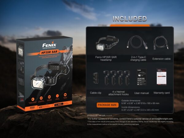 Професионаленият челник за каска Fenix HP35R SAR 4000 lm е създаден за професионалисти и предназначен за екстремни условия. Комбинираният превключвател с въртящи се бутони ви позволява да избирате между различни нива на далечна светлина, близка светлина или и двете – за главозамайващите 4000 максимални лумена с почти 500- метра излъчване. Пакетът с батерии съдържа две вградени батерии с капацитет 5000 mAh и може да се използва като захранваща банка за зареждане на други устройства. В батериите е вградена червена светлина за безопасност, която се използва за предупреждаване на другите за вашето местоположение. Изданието SAR се предлага с термоустойчива силиконова каишка, монтаж за каска и щипки за каска, докато стандартната версия има перфорирана светлоотразителна бандана. Пламъкоустойчивата и огнеустойчива гумена лента за глава и дизайнът на бързо сглобяващия се кожух позволяват на лампата да бъде съвместима с различни видове каски (само издание SAR). Силиконовата лента за глава може да се използва нормално в температурен диапазон от -20°С до 120°С.