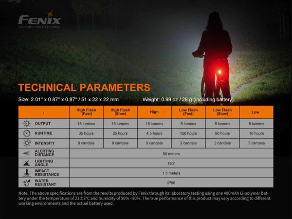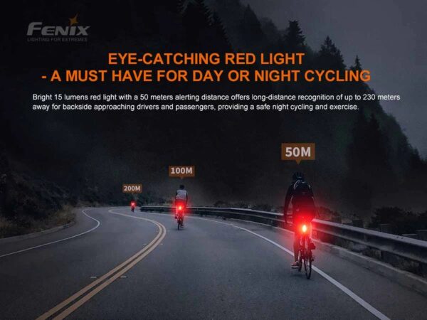 Fenix BC05 V2.0 е акумулаторна задна светлина за велосипед, създадена да предпазва велосипедистите. Ще бъдете забелязани в трафика с нейната мощност от 15 лумена червена сигнална светлина. Шестте режима включват различни скорости на мигане, както и различни нива на яркост, така че можете да изберете кой режим е най-подходящ за текущите условия. Вградената литиево-полимерна батерия от 400 mAh осигурява максимум 120 часа работа (в режим на мигане), което ще издържи два месеца с едно зареждане, ако пътувате средно около 2 часа на ден. Удобно зареждане чрез интерфейс Type-C. С клас IP66, устойчив на дъжд и прах, този заден фар за велосипед ще ви помогне да направите пътуването си с велосипед много по-безопасно.