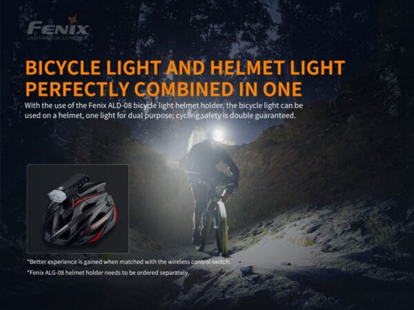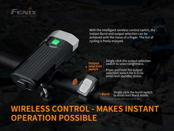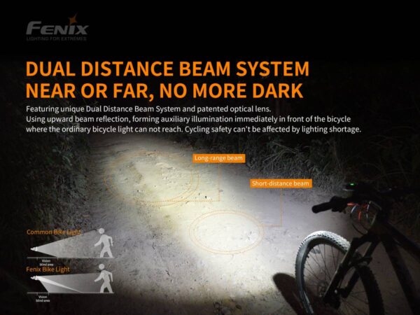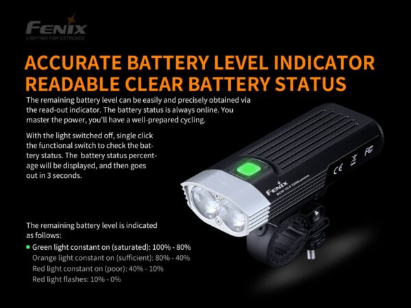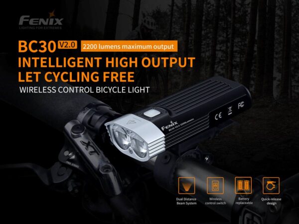 Велосипедният фар Fenix BC30 LED 2200 лумена е акумулаторна велосипедна светлина с две литиево-йонни батерии 18650. Два Cree XM-L2 T6 светодиода осигуряват неутрална бяла светлина за добро възпроизвеждане на цветовете и имат максимална светлинна мощност от 1600 лумена. Разбира се, тази велосипедна светлина е оборудвана и с иновативната система „Dual Distance Beam System“. Това създава по-широк лъч на къси разстояния и по-тесен лъч на по-дълги разстояния, което води до оптимална видимост за всеки велосипедист. OLED дисплеят на BC30R е наистина уникален и улеснява отчитането на заредеността на батерията. Когато включите велосипедната светлина, OLED екранът показва точно колко време остава в избрания режим. Това ви дава ясна оценка за това колко време ви остава, за да се приберете вкъщи. Fenix ​​е добавил допълнителен превключвател, който може да премине в режим на серийно осветление незабавно. Превключвателят работи както когато светлината е включена, така и когато е изключена. Този превключвател може например да се постави на кормилото и да се закрепи към фара чрез micro-USB. О-пръстенът гарантира, че водата няма да проникне в лампата.