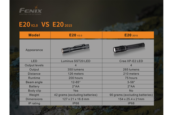 Fenix E20 V2.0 е леко фенерче, което ще носите навсякъде. Захранвано с две батерии АА достига максимална мощност от 350 лумена. Най-забележителното е единичният заден превключвател, който се използва за включване на фенерчето и също така контролира различните нива на мощност. Други характеристики включват патентованата ултра тънка оптична леща, която е с дебелина само 3 мм и постига ъгъл на лъча 85 °.