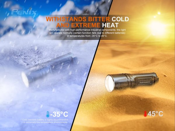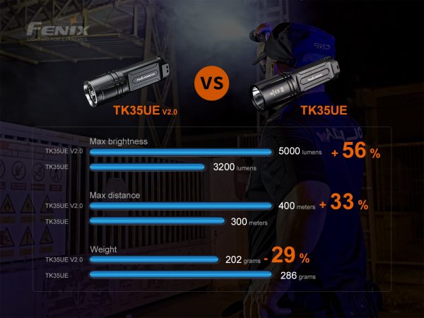 Фенерът Fenix TK35UE V2.0 5000 Лумена е високоефективен тактически модел с двоен режим на работа. Захранван от две батерии 18650, светлината осигурява максимална мощност от 5000 лумена с голям обхват и разстояние от 400 метра. Иновативният механичен превключвател ви позволява свободно и бързо да превключвате между тактически, дежурен и стопиращ режим. Мигновеният светлинен сигнал, функцията за блокиране, плоското тяло и уникалните превключватели в задната част на фенера правят Fenix TK35UE V2.0 готов да отговори уверено на нуждите на военните и правоприлагащите органи, както и на всеки любител на дейностите на открито.