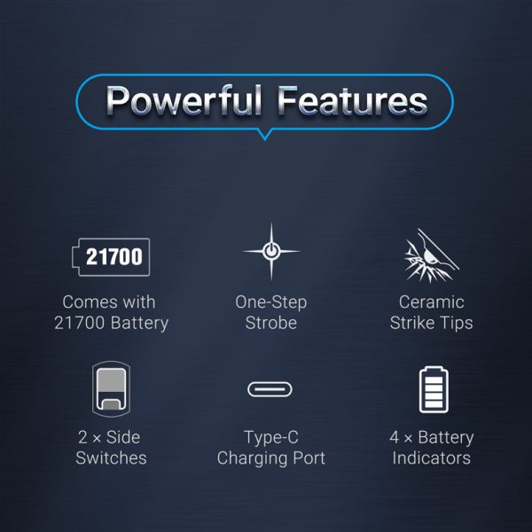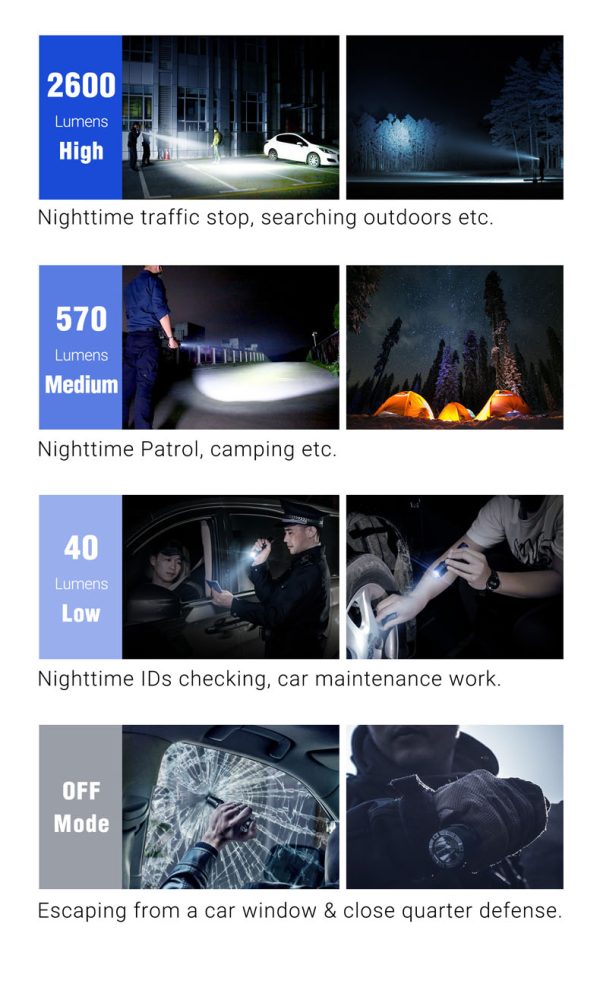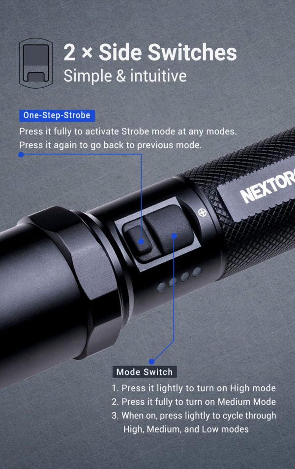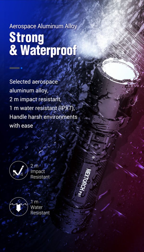 Фенерът Nextorch P81 е супер ярък фенер с изключително високи възможности, перфектен за нощно патрулиране, мисии за търсене и спасяване и арести. Захранван от 1 × 21700 батерия и LUMINUS SST-70 LED, той има максимална мощност от 2600 lm и максимално време на работа от 38 часа. Основният му материал, аерокосмическа алуминиева сплав с твърдо анодиране, ви дава първокласен външен вид и усещане. Два странични бутона за включване и промяна на режимите. С три супер твърди керамични накрайника за удар с помощта. на които може да счупите бързо и лесно стъкла на автомобили и др. С 4 индикатора на батерията можете удобно да определите състоянието на заряда. Завъртайки светлинната глава обратно на часовниковата стрелка, ще се разкрие скрит порт за зареждане Type-C.