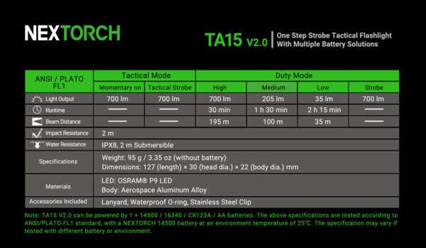 Фенерът Nextorch TA15 V2.0 Multi-Battery Tactical Flashlight е тактически фенер с универсална съвместимост на различни батерии, снабден с OSRAM® P9 LED диод ( 700 лумена ), 6 режима на работа 700, 205 и 35 лумена, и два вида Strobe, бутон с възможност за моментно включване. Смяната на режимите става чрез пръстен пред бутона за моментно включване. Фенера работи с алкални батерии АА 1,5V, литиеви батерии 3V CR123 и презареждаеми батерии 14500 3.6V или 16340 3.6V ( макс. 700 лумена). Тяло изработено от анодизиран алуминий с изразена текстура, клипс за носене с възможност за махане и глава с възможност за чупене на стъкло, и подобни по-крехки материи. Удароустойчив до 2 метра и водоустойчив по стандарт IPX-8 до 2 метра.