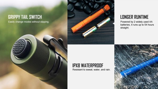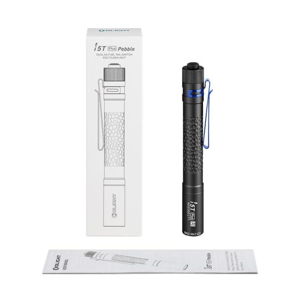 Фенерът Olight i5T Plus Pebble e със заден бутон за управление и множество опции. Отличава се с ново тяло Pebble (камъчета), уникален дизайн с отлична вентилация и здрав захват. Моделът е с цветова температура неутрално бяло (4000-5000К), NW високопроизводителен светодиод, съчетан с PMMA оптична леща, произвежда лъч от 550 лумена или 15 лумена. Мощността на батерията (2бр. алкални 1,5V AA )в сравнение с i5T е удвоена, времето на работа достига до 54 часа. Разполага и с двупосочен клипс, който може лесно да се прикрепва, към джоб или каишка на раница за използване без ръце. Мощен и с много опции, i5T Plus е страхотна EDC светлина за ежедневни задачи.