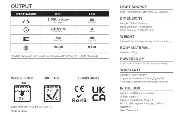 Характеристики на Ловен комплект Olight Warrior X 3 2500 Лумена
