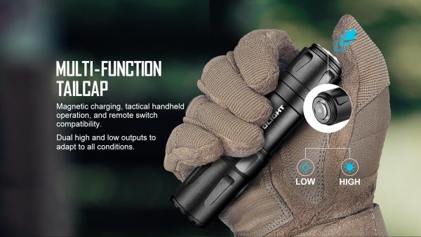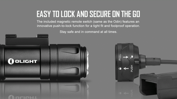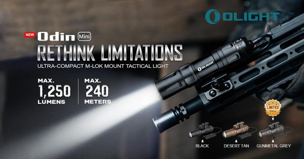 Фенер за дълго оръжие Olight Odin 1250lm. Това е новият, компактен фенер на Olight за карабина, който е предназначен за директен монтаж на М-LOCK релси. Корпусът на фенера е снабден със специален бърз крепеж. Както и останалите модели от тактическата серия на марката, фенерът наследява безшумният магнитен бутон, магнитното зареждане на батерията и безшумната вибрация – сигнал за изтощена батерия. В комплект с уреда е включен и специалният магнитен кабел за пушка със специална функция за допълнително заключване, към корпуса на фенера. Захранването е осигурено от модифицирана батерия 18500 с капацитет 2040ma/h. PMMA оптиката осигурява максимална далекобойност на лъча до 240м. и 1250 лумена турбо режим (както и икономичен режим 200lm.). Корпусът е изработен от авиационен алуминий и е водоустойчив по IPX8 стандарта. Фенерчето позволява моментно и постоянно задействане, както чрез бутона така и чрез магнитния кабел. Фенерчето може да се използва, както монтирано на оръжието, така и отделно.