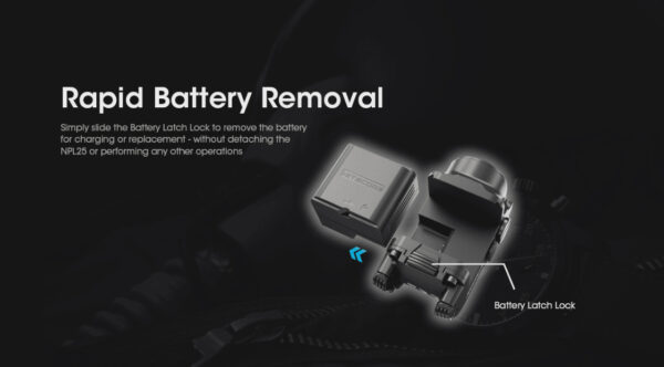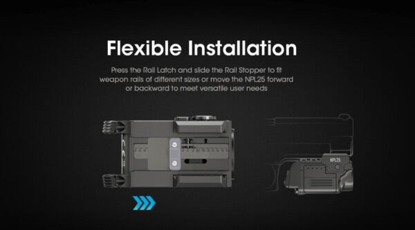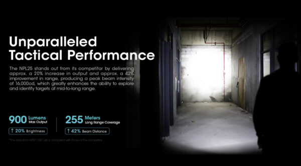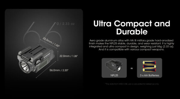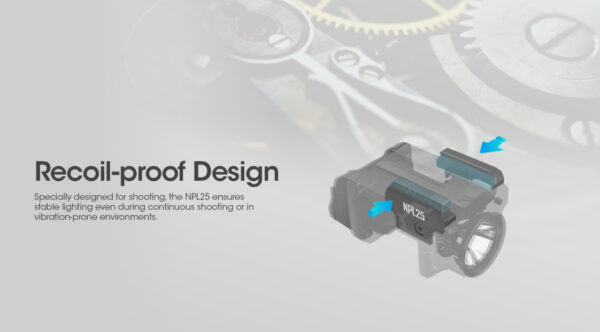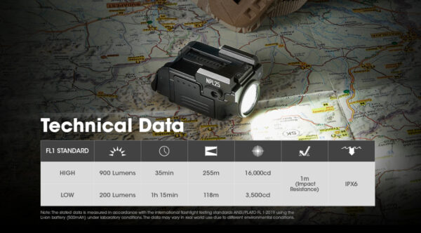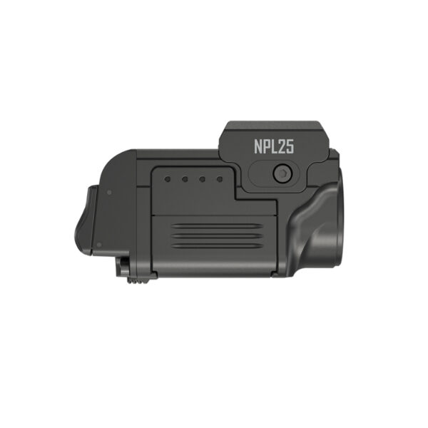 Пистолетеният фенер с лазерен целеуказател Nitecore NPL25 е оборудван с най-съвременния светодиод NiteLab UHi 20 LED, който осигурява впечатляващите 900 лумена с обхват на лъча до 255 метра и интензитет на лъча 16 000 cd (кандела). Захранва се с 1 Li-ion батерия 500mAh (включена в комплекта). Има индикатор за заряда на батерията и магнитно зарядно за зареждане на батерията (време за пълно зареждане на батерията: 1 час и 10 минути). Времето на автономна работа (при 900 лумена) е 35 минути. NPL25 е изключително компактен, лек (тежи само 66 грама с батерията) и е лесен за монтаж, управлява се от двойни задни превключватели за универсално достъпен контрол с 2 режима на светене – постоянна и моментна светлина – натиснете бързо превключвателя за постоянна светлина или го задръжте натиснат за моментна светлина. ATR технологията осигурява ефективно разсейване на топлината и издържа на падане върху твърда повърхност от височина 1 метър. Моделът покрива стандарта IPX6 (защита срещу мощни водни пръски). Фенер Nitecore NPL25 е специално създаден за монтаж на релса, който пасва на повечето компактни и пълноразмерни пистолети. Специално създаден за стрелба, устойчив на откат, осигурява стабилно осветление по време на продължителна стрелба или във вибрираща среда. Оборудван със зелен лазер.