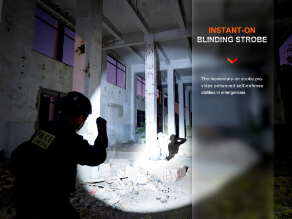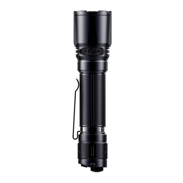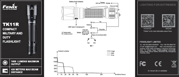 Зарядният фенер Fenix TK11R LED е издръжливо, универсално тактическо фенерче с размер на длан, предназначено за полицията, за търсене и спасяване и за използване на открито. С двойния си заден превключвател TK11R е изключително лесен за управление, разполага с 3 универсални настройки на яркостта от 30, 350 и 1600 лумена за патрулиране/търсене и предлага впечатляващ обхват на лъча от 420 м. TK11R се захранва от литиева акумулаторна батерия с капацитет 3400 mAh, която лесно се сменя с резервна. Зареждането става чрез USB-C гнездо в шийката на фенера. Защитен с гумено покритие, портът за зареждане е и вътрешно водоустойчив за максимална надеждност. Ултракомпактната форма на TK11R е идеална за използване както в ръка, така и за монтиране на оръжие. Контактните пружини в двата края на отделението за батерията предпазват батерията от откат/удар и осигуряват отличен електрически контакт при всякакви условия. Превключвателят за захранване е с възможност за постоянно и моментно включване, а превключвателят за режими дава бърз достъп до 3-те нива на яркост, както и до моментален строб, който може да се активира при включено или изключено фенерче.