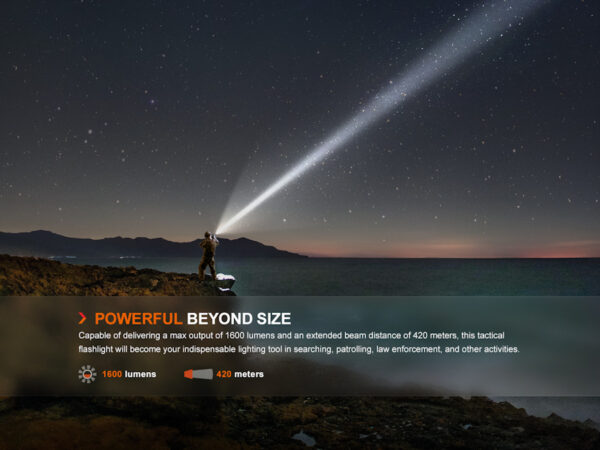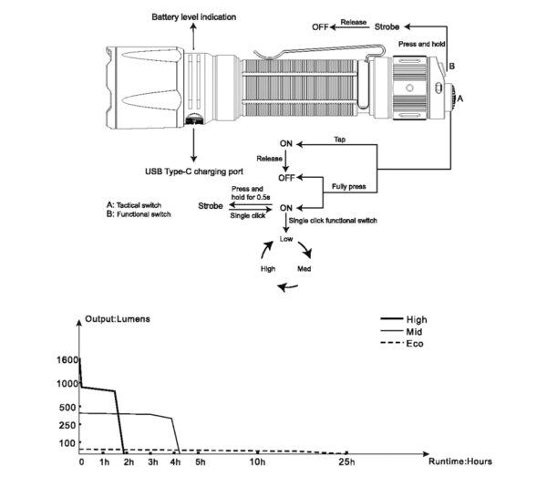 - Висока: 1600 лумена (общо 1 ч. и 50 мин.) – 420 м лъч (търсене на разстояние / защита)