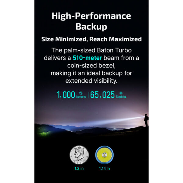 Зарядният Фенер Olight Baton Turbo е изключително мощно и компактно EDC фенерче, проектирано за ситуации, в които се изисква надеждност, дълга далекобойност и удобство при носене. Със своя максимален обсег до 510 метра, това фенерче предлага ярко централизирано петно и широка периферна подсветка, благодарение на рефлектора с размер на монета. Въпреки компактния си размер – само 3,2 инча (около 8 см) дължина и тегло 3,2 унции (90 г), Baton Turbo осигурява производителност, която конкурира много по-големи фенери. Независимо дали се нуждаете от светлина за къмпинг, търсене и спасяване, спешни ситуации или ежедневна употреба у дома, този модел е проектиран да отговори на изискванията. Батерията поддържа удължено време на работа, а възможностите за зареждане го правят още по-гъвкав в движение. Компактният дизайн позволява носене в джоб, прикрепяне към козирка на шапка или използване с връзка за ръка – идеално за свободни ръце.