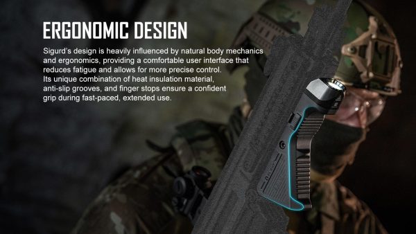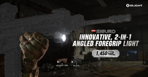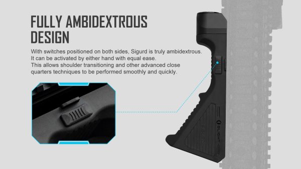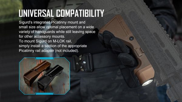 Зарядният фенер ръкохватка Olight Sigurd 1450 Лумена е иновативна предназначена за монтаж, към Picatinny релса. Ергономично наклонената ръкохватка разполага с жлебове против приплъзване и ограничител за пръстите и осигурява удобно захващане, като същевременно изолира топлината между цевта и ръката. Този продукт използва популярната Picatinny система за монтиране, но и може да се монтира и, към релси M-LOK с адаптер за релса Picatinny. Фенерът е с водоустойчивост IPX4, вградена батерия с капацитет 2400ма/ч се зарежда лесно, с помощта на магнитно зарядно устройство Olight.
