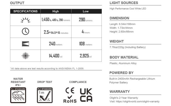 Характеристики на Заряден Фенер ръкохватка Olight Sigurd 1450 Лумена