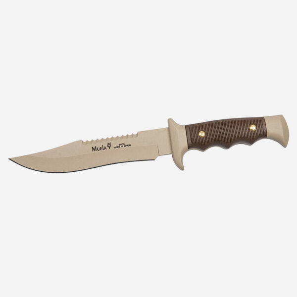 Ножът MUELA 5162-D е здрав и надежден нож, изработен от испанския производител Muela и проектиран за работа в различни полеви условия. Моделът разполага с фиксирано острие с дължина 16 см от стомана Nitro-42, която осигурява добра устойчивост на корозия, стабилност и твърдост около 55–56 HRC. Острието е в стил „Bowie“ и комбинира гладък режещ ръб с функционалено серетиране на гърба, подходящ за рязане на въжета, дърва и други по-твърди материали. Дебелината 3.5 мм и формата на острието гарантират надеждност при широк спектър от задачи – от къмпинг и туризъм до оцеляване и тактически приложения. Дръжката е изработена от устойчива комбинация zamak + ABS, което осигурява здравина, комфорт и добро сцепление, дори при влажни условия или работа с ръкавици. Ножът се предлага в комплект с издръжлива кания, удобна за носене и съхранение. Muela 5162-D е отличен избор за любители на природата, приключенци и всички които търсят универсален, и надежден нож за ползване на открито.
