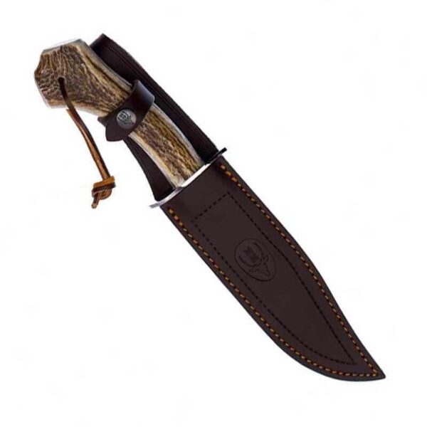 Ловният Нож Muela ALBAR 18H X50CrMoV15 Еленов рог е нож, създаден специално за любителите на прибори за хранене и готвачите на барбекю, които ценят ножове с първокласни материали, като например еленов рог, използван в ръкохватката му. Острието е изработено от X50CrMoV15 “MOVA” (1.4116), който е класически материал в ножовете Muela, представляващ отлична комбинация от молибден и ванадий, което образува стомана с отлична твърдост и устойчивост на корозия. Ръкохватката е направена от еленов рог, невероятно детайлен и в същото време устойчив материал. Еленовите рога падат през зимата и растат отново през пролетта, така че няма жестокост в използването на този материал, който отдавна се използва в производството на ръчно изработени ножове. Muela Albar-18H е отличен нож за обработка на различни видове месо, в комплект с кожена кания.