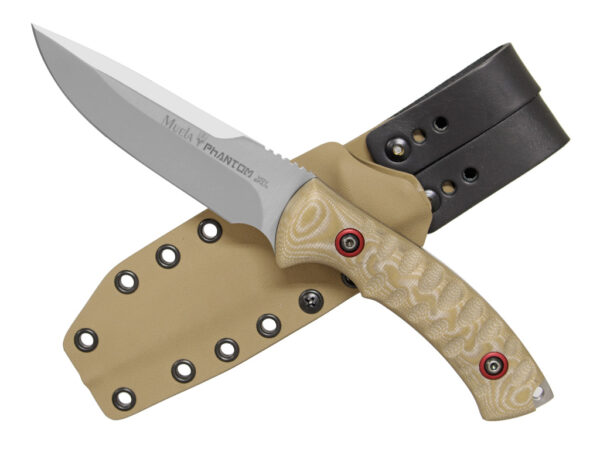 Ножът MUELA PHANTOM-12D/K е нож с фиксирано острие, създаден за лов, къмпинг и полеви дейности. Острието е дълго 12 см и е изработено от неръждаема стомана MoVa (X50CrMoV15), която осигурява отлична устойчивост на корозия, стабилност и дълготрайна острота. С дебелина около 4 мм и твърдост 56–58 HRC, острието е подходящо за разнообразни задачи — от прецизно рязане до по-стабилни натоварвания. Дръжката е от Micarta в пясъчен цвят, осигуряваща удобен и надежден захват дори при влажни условия. Ножът е с full‑tang конструкция, което гарантира здравина и устойчивост. Включената Kydex кания е мултипозиционна и позволява лесно и безопасно носене на колан или екипировка. С обща дължина около 24,5 см и тегло 238 г, Muela PHANTOM‑12D/K комбинира практичност, здравина и удобство, като е идеален избор за ловци, туристи и всеки, който търси надежден нож за приключения на открито и тактически задачи.