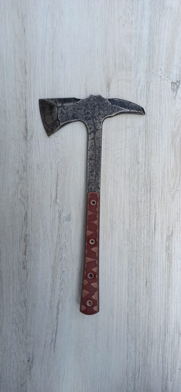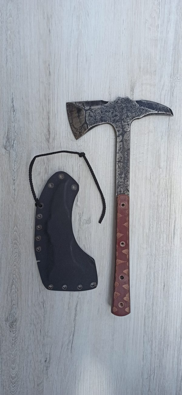 Брадва ръчно изкованa, острие изработено от стомана 65MN зоново закалена, Stone Wash покритие. Full tang конструкция с чирени от текстолит. Kydex кания за съхранение на острието и безопасност при носене.