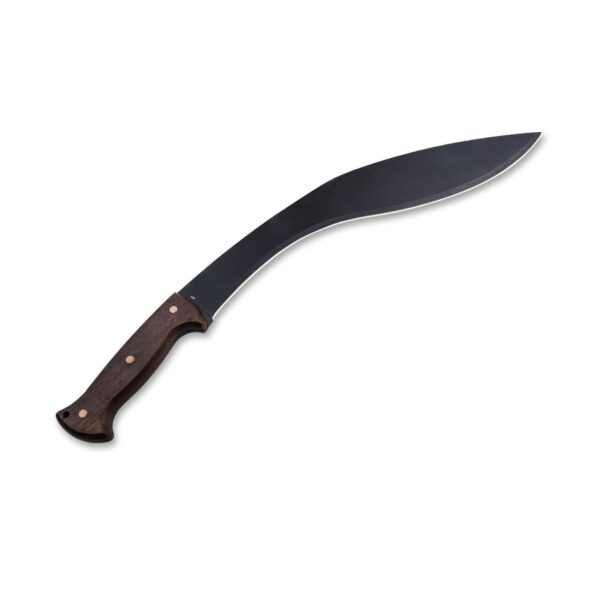Мачетето Boker Magnum Kukri Machete 420 wood премахва всички притеснения, когато става въпрос за напредък в гъстите храсталаци. Тънкото и гъвкаво острие от стомана 420 има черно покритие, което основно предпазва от надраскване и корозия, но също така предлага тактическа камуфлажна функция. В допълнение към свободното прорязване на пътя ви в джунглата, мачетето с традиционната непалска форма на острието е идеално за цепене на дребни дърва за лагерен огън. Дървените чирени на дръжката са с приятна форма и позволяват работа без усилие. Трите месингови нита допринасят и за декоративните акценти. Доставя се с отвор за ремък и персонална полиестерна кания. Поради тънкото и гъвкаво острие, мачетето не е подходящо за удари като с бухалка!