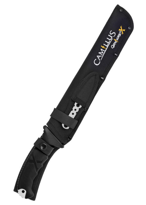 Мачетето Camillus Carnivore X с пълен танг се държи удобно в ръката благодарение на ергономичната си, грапава дръжка от черна ABS пластмаса с вдлъбнатини за пръстите. Дългото приблизително 28,8 см острие от неръждаема стомана 3Cr13 е особено устойчиво на корозия благодарение на допълнителния процес на свързване с титан и остава остро за по-дълго време благодарение на допълнителната твърдост. В допълнение към заострения шип, задната част на острието има дълъг приблизително 20 см назъбен ръб, което означава, че мачетето може да се използва и за рязане. Влючено е и малко ножче с острие с капковиден връх и шипове на гърба на острието, което е снабдено с ухо в края на дръжката и може да се използва като шестоъгълен ключ благодарение на практичните си отвори или като връх на копие, ако се прикркепи по подходящ начин. Както мачетето, така и малкият нож се предлагат с калъф от балистичен найлон. Комплектът е идеален за рязане на дърва, лов, земеделие и градинарство или просто като идеален инструмент за оцеляване на открито за къмпинг или в дивата природа.