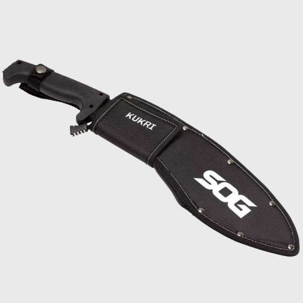 Обърнато е специално внимание на SOGFari, за да се гарантира, че теглото е правилно и ръкохватката удобна за продължителна употреба. Добавен истински работещ трион на гърба на 12-инчовото 3Cr13 черно Kukri острие с двойно шлифовани зъби, които режат дълбоко. Извън задната част на гумената ръкохватка има шипове за удряне и стържене. SOGFari Kukri е най-добрият инструмент за оцеляване, изследване и приключения. Включва найлонова кания.