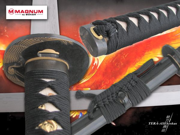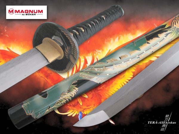 Мечът Boker Phoenix Damascus на немската фирма Бьокер Магнум е наистина премиум меч. Черно – бялата дръжка и леко автентичният завършек правят меча с още по – неповторим вид. Тsuba е украсен с автентични японски мотиви. Материалът на острието е Дамаска стомана с 200 слоеве и ръчно изработена. Канията е изработена от дърво, лакирана в черно и е нарисувана митичната птицата Феникс, която изгаря и след това отново се издига от пепелта си.