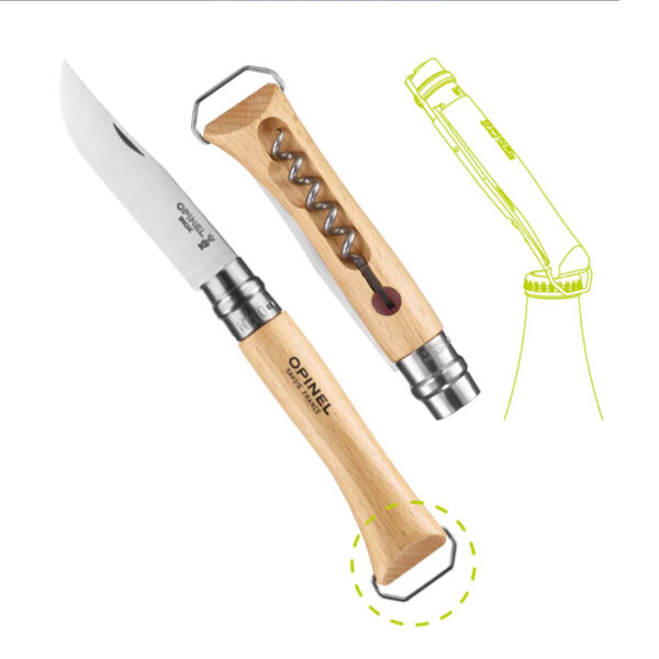 Комплектът нож Opinel No.10 е с удобна приставка за отваряне на бутилки. Този нож е идеален за следващия ви пикник! Изработен с дръжка от букова дървесина, той разполага с 5-оборотна стоманен тирбушон, който може да се справи дори с най-упоритите тапи. Освен това в края на дръжката е разположена патентована отварачка за бутилки, която ви позволява без усилие да отваряте любимата си бутилирана напитка.