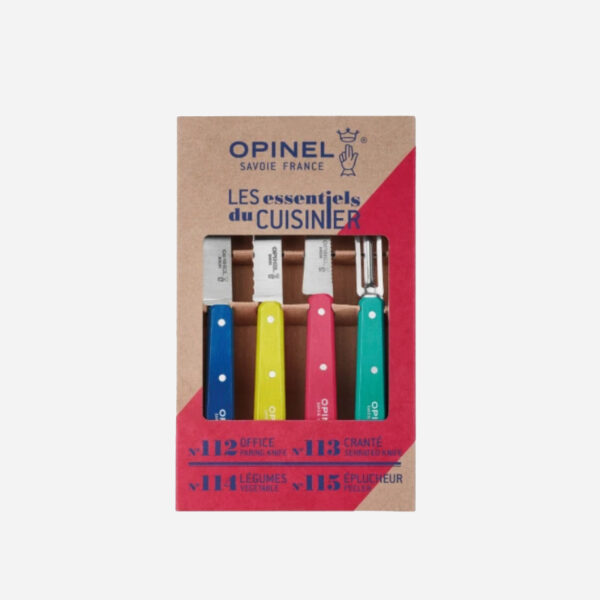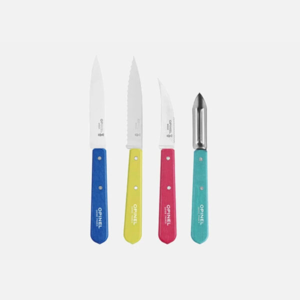 Комплектът ножове OPINEL POP 80 включва четири малки кухненски ножа с впечатляващи дръжки, които са ежедневни кухненски принадлежности: – обикновен син нож за рязане с гладко 10 cm острие от неръждаема стомана – назъбен нож цвят лимон, с 10 см назъбено острие от неръждаема стомана – малинов нож за зеленчуци със 7-сантиметрово острие от неръждаема стомана – тюркоазено ножче за белене с 6 см острие от неръждаема стомана Този комплект е произведен във Франция. Ножът за зеленчуци е с фино острие, идеално за прецизни и деликатни задачи като белене, гарниране и издълбаване на плодове и зеленчуци, но не е подходящ за рязане на големи зеленчуци с твърда кожа като тиква или целина.