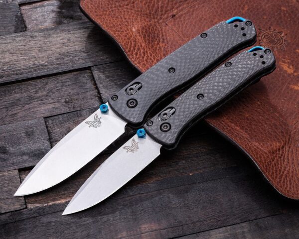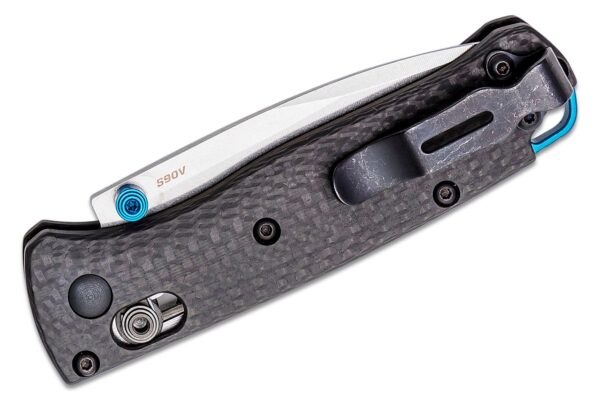 23Сгъваемият нож 533-3 MINI BUGOUT S90V Carbon Fiber е с гладко острие от неръждаема стомана S90V с твърдост 59-61HRC и DLC покритие. Ръкохватка е изработена от Carbon Fiber, със син анодизиран алуминиев щифт за палец, голям отвор за ремък и реверсивен мини клипс за джоб за дълбоко носене от черен оксид. Заключването на острието става чрез AXIS Lock. Bugout® е проектиран за съвременния авантюрист на открито, включващ най – леките и най – качествени материали в изключително компактен, но ергономичен краен продукт.
