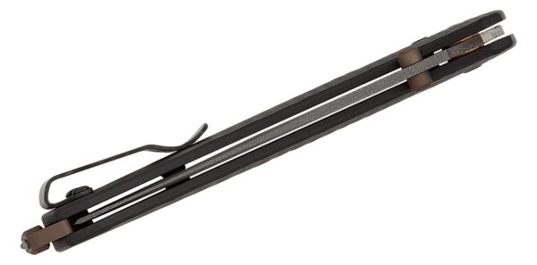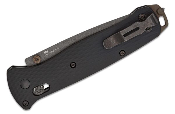 Сгъваемият нож Bailout Tanto CPM M4 Aluminum е лек, здрав джобен нож. Bailout е по-голяма версия на известния Benchmade Bugout. Един от най-добрите EDC ножове, произвеждани някога, предназначен за туристи, които обръщат внимание на всеки грам. Тази подобрена версия на Bailout без съмнение е още един хоумрън на Benchmade. Острието е изработено от стомана CPM M4. Това е инструментална стомана с голямо запазване на остротата. M4 също е наистина здрав и в сравнение с други видове супер стомана, относително лесен за заточване. Единственото нещо, на което трябва да обърнете внимание, е ръждата: CPM M4 не е устойчив на корозия. За да компенсира това, Benchmade подобри острието със сиво Cerakote покритие. Първото нещо, което ще забележите, е ръкохватката, изработена от висококачествен алуминий вместо пластмаса. Резултатът е по-здрава, по-малко гъвкава дръжка с диамантени чирени за допълнително сцепление.