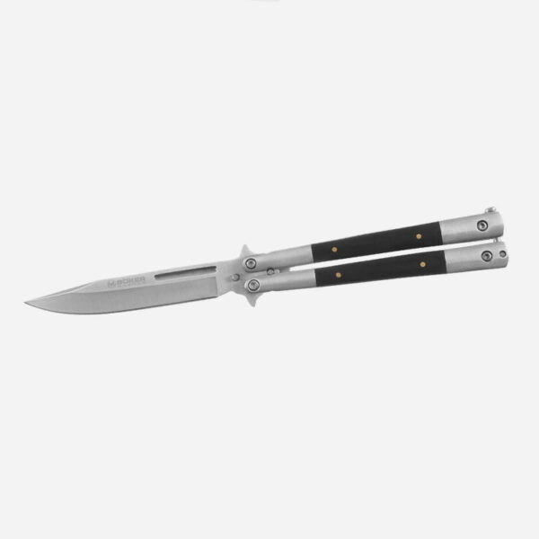 Тази нова пеперуда носи класическа комбинация от неръждаема стомана и дърво пакка. Конструкцията с болтове придава на ножа висока функционалност и стабилност. Острието от 440 стомана е снабдено с жлеб. Balisong Wood има клипс, което го прави много удобен за носене.