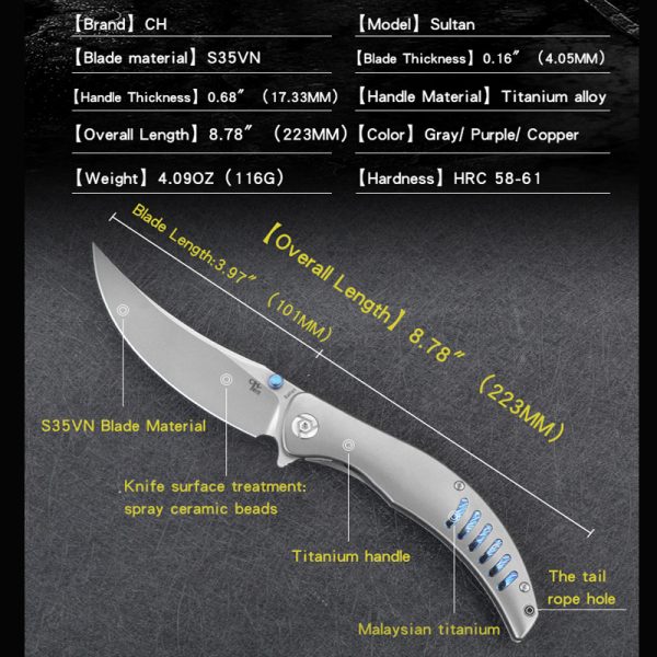 Нож CH KNIVES Sultan Titanium е прекрасен, както за ежедневна употреба така и за къмпинг, лов, оцеляване в екстремни ситуации. Обща дължина 223 мм с тънка ръкохватка от материал Tитан и острие от стомана S35VN. Ножът е с тънък и с уникален дизайн, керамично покритие на острието и заключващ механизъм Frame Lock. Отварянето е много плавно и гладко благодарение на това, че ползват лагери. CH KNIVES предоставят едни изключително качествени ножове, които ще допаднат на всички любители на ножовете.