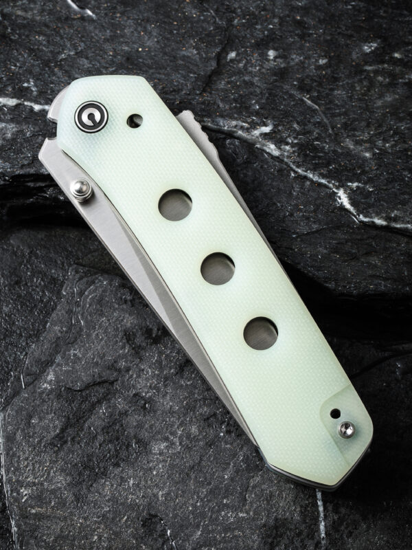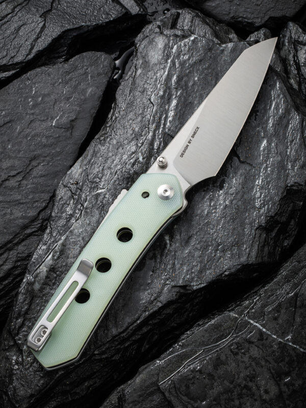 Ножът CIVIVI Vision FG Nitro-V G10 е уникален джобен нож, проектиран от Snecx Tan. В Инстаграм той е известен със своите уникални персонализирани ножове. Със своите обичаи той придава ново значение на термините „прецизност“ и „иновация“. Vision е отличен пример за това. Ножът е усъвършенстван с разработения от Snecx „механизъм Superlock“. Механизмът „Superlock“ е нещо, върху което Snecx и WE Knife работят от години. Той работи по следния начин: гръбнакът на дръжката е подсилен с титаниев прът, който се закача точно под джобната щипка в дръжката. Краят му се натиска в изрез между острието и щифта с помощта на пружина в дръжката, като блокира острието. Натиснете пръчката назад и острието ще се отключи. Това е изненадващо интуитивно заключване, идеално за използване както от лява, така и от дясна ръка! Дизайнът на Vision също е типичен за Snecx и е подсилен с много интересни дизайнерски елементи. Например, просто погледнете тези кръгли изрези в дръжката. Те могат да бъдат открити и при много от неговите персонализирани ножове. Да не забравяме: материалите също са страхотни!