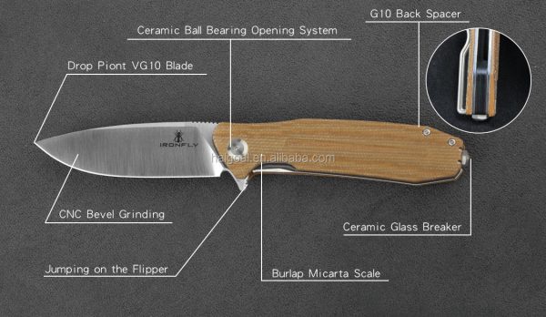 Ножът Ironfly Zesty е новак но, вече е спечелил своите почитатели. „Бюджетните“ EDC ножове от качествени материали ще се харесат на всеки, който търси издръжлив нож на ниска цена. Острието е тип Drop point e изработено от висококачествена стомана VG-10. Заключването е Liner Lock. Ръкохватката е от Micarta. В средата на дръжката има кръгла издатина за по-добро задържане и контрол на ножа. Клипсът e с телена конструкция и е реверсивен.