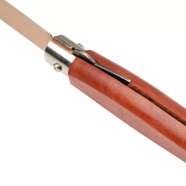 Ножът MAM Douro pocket knife with bronze titanium blade е удобно джобно ножче със заострено острие. Ножът е кръстен на река Дуро в Португалия. Както при всички ножове MAM, острието се отваря с прорез за нокътя. Дръжката на Douro е малко по-дебела в средата и в края, така че се усеща удобно в ръката. Дръжката на този нож е изработена от дърво бубинга. Дървото бубинга е естествен продукт, което прави всеки нож уникален. Сребристата алуминиева основа държи острието и дръжката заедно. Този нож има острие тип клипс пойнт и тънък слой титаниево покритие. Острието има автентичен Liner Lock. Тази ключалка е оформена от извито парче неръждаема стомана. Това парче стомана е красиво вплетено в дръжката. Liner Lock има семпла извивка, която го прави много лесен за работа.