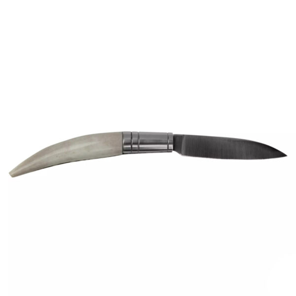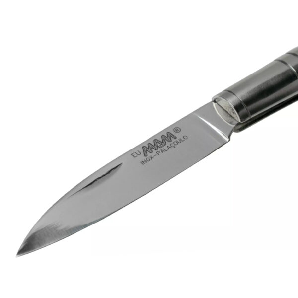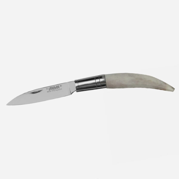 Ножът MAM Pocket knife with deer antler handle е голямо джобно ножче, което пасва удобно в ръката. Острието с дръжка тип „drop point“ се отваря с вдлъбнатина за нокът. Няма заключващ механизъм, който да държи острието на място. Дръжката е изработена от еленски рог, което придава на всеки нож уникален дизайн и осигурява много фина, гладка повърхност. Благодарение на леко извитата форма на дръжката, можете да държите ножа здраво и да прилагате сила. Еленските рога са естествен продукт, тъй като елените губят рогата си всяка година. Сребристата алуминиева втулка държи острието и дръжката заедно. Този нож има острие тип „drop point“ и няма заключващ механизъм. Това е класически начин за изработване на джобни ножове. Това означава, че ножът може да се носи законно в почти всички европейски страни.