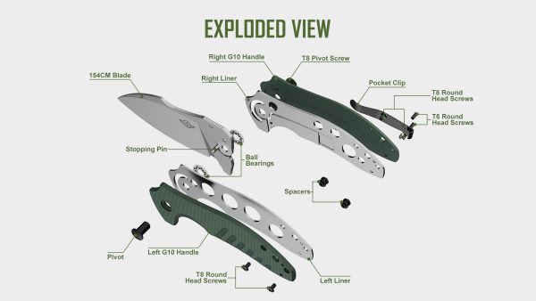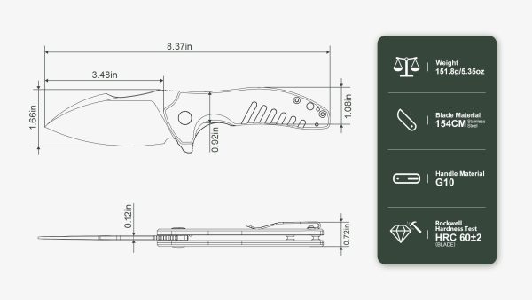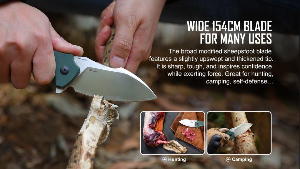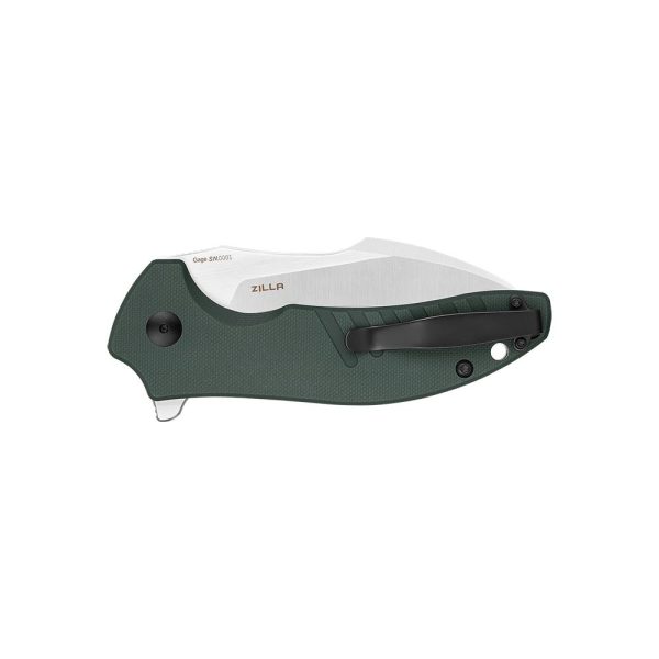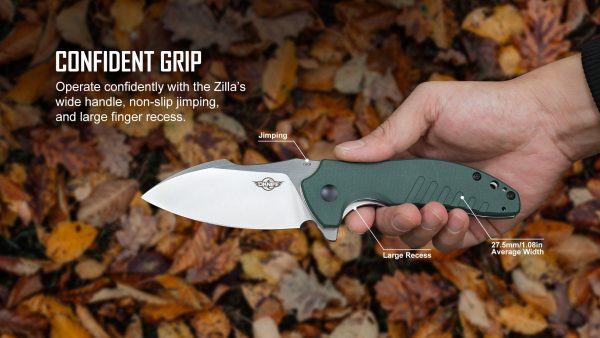 Ножът Oknife Zilla 154CM е здрав, универсален, сгъваем с модифицирано острие тип Sheepсfoot, изработено от неръждаема стомана 154CM с висока устойчивост на износване и корозия, закалена на 58-60HRC. Формата му се отличава с леко извит и удебелен връх, което го прави идеален за лов, къмпинг, обработка на дивеч, самозащита и др. Ръкохватката е изработена от е от G10 с висока якост и издръжливост, широка, очертана и текстурирана осигурява удобен захват. В дръжката е интегрирана здравата ключалка Liner Lock, острието, работещо чрез система със сачмени лагери с ниско триене, позволява на потребителите плавно отваряне на ножа с двустранно с палец, чрез фронт флипер. Двустранен клипс за дълбоко носене, Zilla е отлично EDC джобно ножче.
