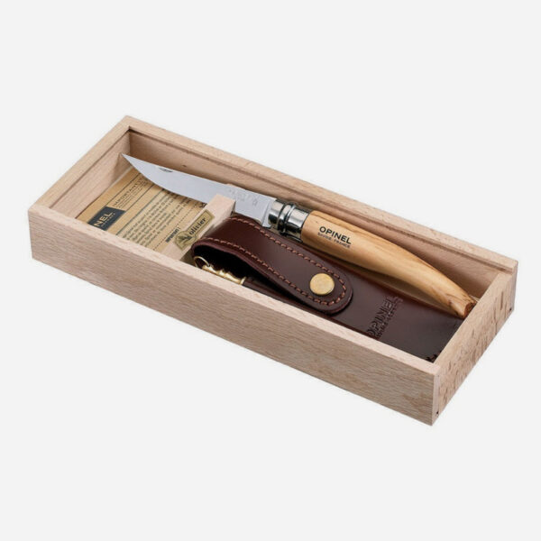 Ножът Oplinel Slim line №10 се предлага в дървена кутия придружена от кафяв алпийски калъф, за да можете да го вземете навсякъде със себе си. Джобното ножче Olive Effilé 10 е с 10 см острие от неръждаема стомана с огледална повърхност. То има безопасна, градска форма с леко заоблен край. Дръжката от маслиново дърво има елегантен силует и се усеща приятно в ръката ви. Този нож е снабден с предпазна яка, която заключва острието в отворено и затворено положение. Този джобен нож може да се използва и като нож за маса.