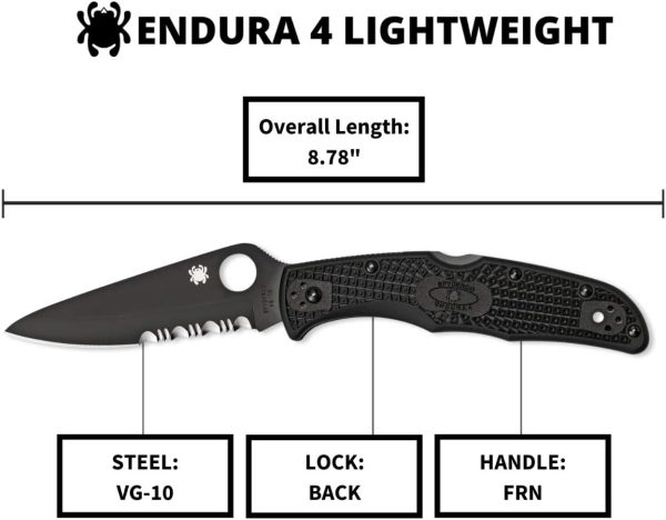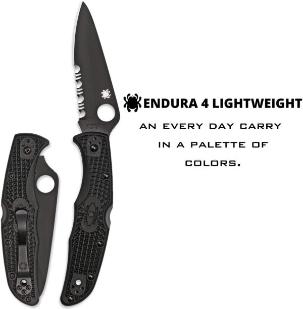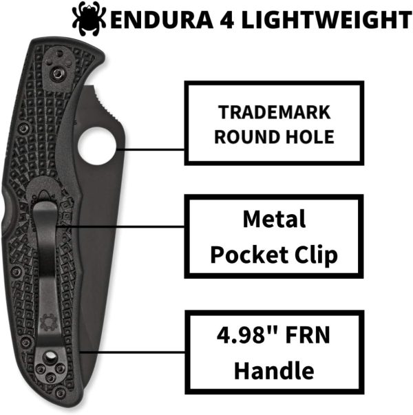 Ножът Spyderco Endura 4 е един от най-продаваните сгъваеми ножове, правени някога. Сега тази специфична версия на дизайна включва здраво острие от неръждаема стомана VG-10 с частично назъбен CombinationEdge и покритие от черен титанов карбонитрид (TiCN). Острието се поддържа от здрав механизъм Back Lock, който го заключва сигурно. Ръкохватката от FRN осигурява сигурно захващане, дори при най-взискателните условия, четири позиционна клипс позволява лесно да се конфигурира с наклон нагоре или надолу от двете страни на тялото.