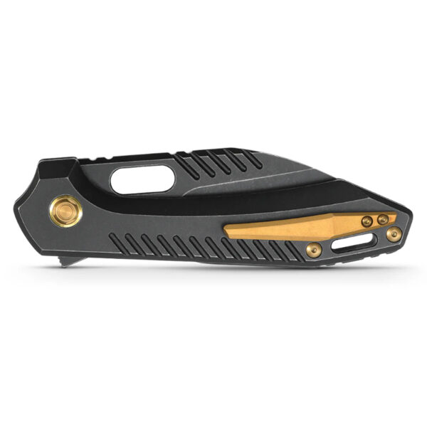 Ножът Vosteed RSKAOS M390 Titanium е водещо сътрудничество между Vosteed и R.S. Knifeworks (Rob Saniscalchi). Ножът е с острие M390 и титаниева дръжка, а също така е снабден с обновен заключващ механизъм – Top Liner Lock. RSKAOS съчетава най-доброто от двата свята – много фактори от обратна връзка на клиенти и високо ниво на здравина на заключването. За разлика от персонализираната версия на Роб с рамкова ключалка, ножът използва собствена ключалка Top Liner Lock, която е подобна на хибрид между insert-liner lock и ключалка Compression Lock. Заключването Top Liner Lock е умишлено проектирано да бъде здраво и сигурно. Когато ножът е в затворено положение, заключващата планка е почти напълно скрита от погледа. Самостоятелната пластина от неръждаема стомана е здраво закрепена във фрезован джоб във вътрешността на титаниевата дръжка и е допълнително подсилена от солиден титаниев гръб. Когато ножът е в отворено положение, заключващата планка ще задържи острието на място и ще предотврати по-нататъшното му въртеливо движение. Подобно на другите ножове на Vosteed, ножът също е оборудван с множество възможности за разгъване. Скосеният отвор за палеца и нископрофилният флипер работят добре заедно, а комбинацията предлага както голямо удобство, така и забавна подвижност. Този нож на Vosteed е базиран на изключително търсения потребителски нож на Роб. Острието е изработено от Böhler M390. Както версията Wharncliffe (3,46„), така и версията Sheepsfoot (3,30“) се отличават със смелия подпис на Роб. Тъмната версия е с черно PVD титаниево покритие както върху острието, така и върху дръжката, и е съчетана със златиста алуминиева шарнирна яка и съответстващ хардуер (винтове и джобни щипки). За да се подобри лекотата на работа и потребителското изживяване, ножът е снабден с CNC фрезован титаниев бутон. Височината и разстоянието на движение на бутона за отключване са проектирани така, че да намалят случайното отключване. Освен това 3D фрезованата титаниева джобна щипка предлага едновременно сигурно носене и елегантна естетика.