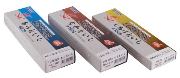 Линията камъни Naniwa Lobster е най-бюджетният вариант на Naniwa. Подобно на традиционните водни камъни, тези също се накисват във вода преди употреба. Този камък е отличен за ползване след употреба на камък с грапавост 120. Ако вашият режещ ръб не е много износен, спокойно може да започнете заточването и с тази едрина на камъка.