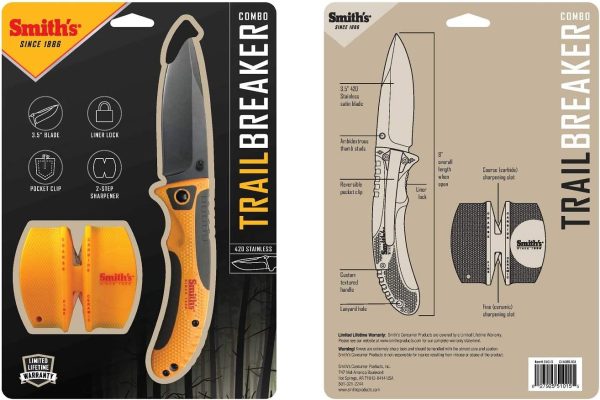 Tочилото с нож включва Smith’s TRAIL BREAKER CCKS COMBO 8.89 см острие с черно покритие, което осигурява допълнителна защита, като същевременно осигурява здрав външен вид. Острието е изработено от прецизна топлинно обработена неръждаема стомана от серия 400. А портативно точило Smith’s CCKS е прекрасно джобно точило подходящо за гладки ножове. Грубо заточване – карбиди, фино керамично заточване (1000).