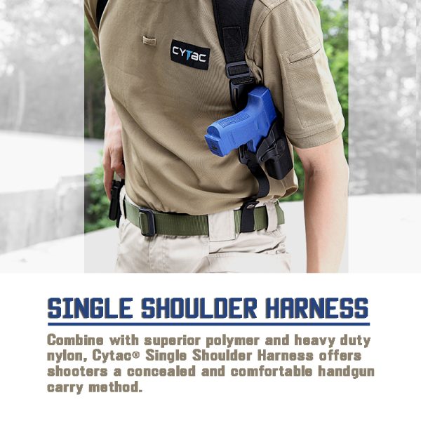 Cytac® Single Shoulder Harness е съвместим с всички кобури от серията R-Defender, двойни холдъри за пълнители и други тактически съоръжения.