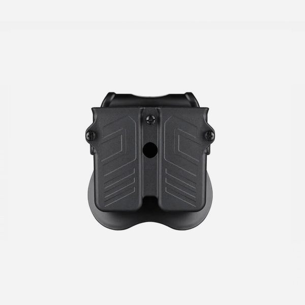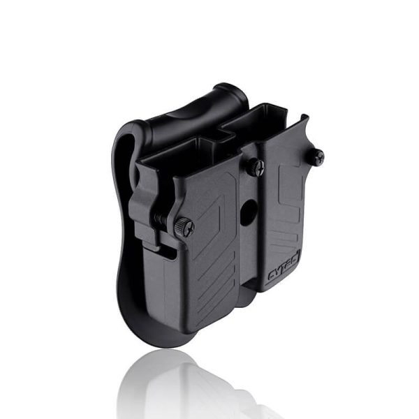 Универсалният двоен държач за пълнители CYTAC Universal Double Magazine Holder CY-MPU е изработен от удароустойчив хай-тек полимер (Съхранение: -40℃ to 200℃). За 2 броя пълнители. Усилието за изваждане на пълнителите се регулира. Крепежът, към колана и тялото е гумиран от вътрешната страна за по-добър комфорт при носене. Ъгъла на носене може да се регулира на 360 градуса, с помоща на ключе, което е в комплект. Като опции, могат да бъдат закупени допълнително крепеж към колан, крепеж към MOLLE система, платформа за носене на бедрото. Подходящ за повечето пълнители 9,.40,.45 Настройва се без инструменти.