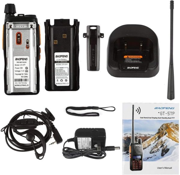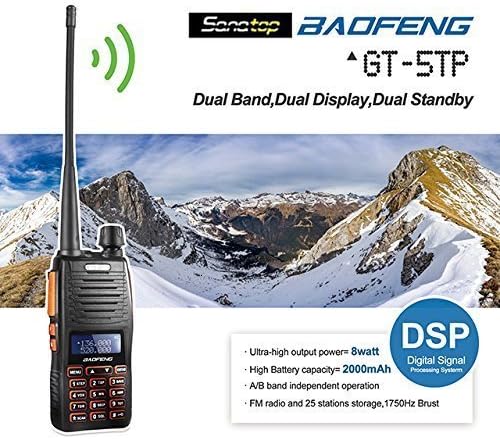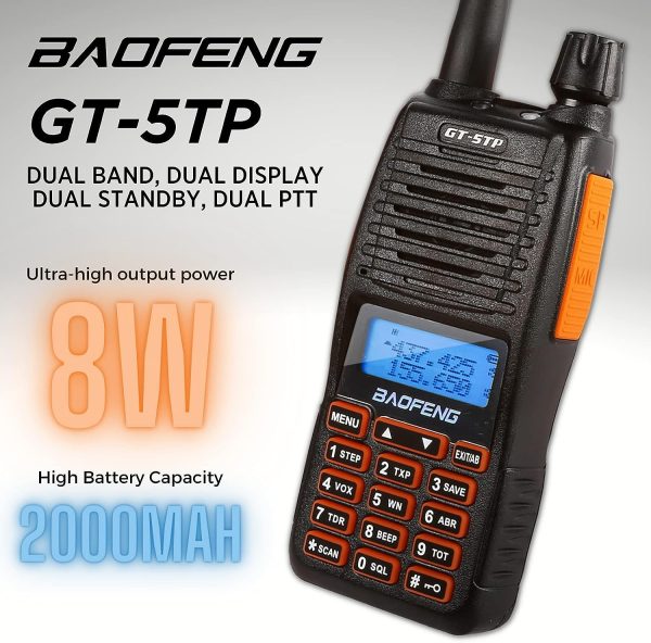 Радиостанцията BAOFENG GT-5 TP е 8-ватово преносимо радио с изключителен дизайн, разработено за американския пазар на базата на популярния Baofeng UV-82. Това е актуализирана версия на радиостанцията Baofeng GT-5. Радиото е оборудвано с актуализиран чип, благодарение на който звукът е станал още по-ясен, а чувствителността е на ново ниво. Сега радиото има три нива на мощност: 8, 4 и 1 вата, а по-вместима батерия от 2000 mAh ще удължи експлоатационния живот.