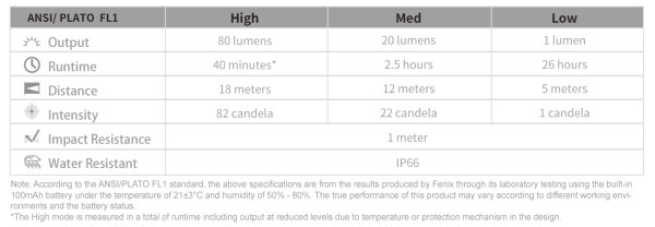 - 80 лумена максимална мощност и 18 метра максимално разстояние на лъча.