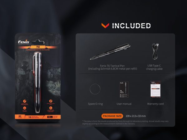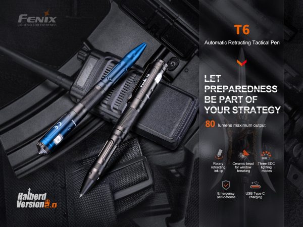 Автоматичната светеща тактическа химикалка Fenix T6 е многофункционална тактическа писалка за самозащита, която може да осветява, да чупи прозорци и да пише. Максималната му яркост достига 80 лумена и поддържа Type-C зареждане. Тази здрава писалка разполага с керамично зърно, което може да счупи стъкло и да помогне за бягство от опасност. Във всяка химикалка има пълнител за писалка Schmidt за гладко писане без усилие. Както можете да очаквате, този здрав, високоефективен инструмент за писане е достатъчно здрав, за да ви осигури тактическо предимство при извънредни ситуации.