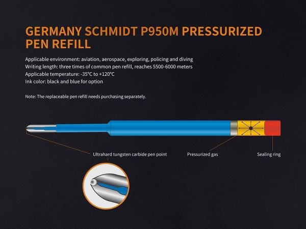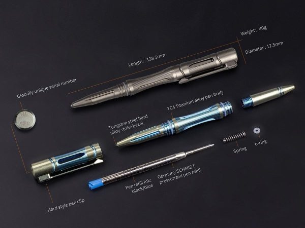 Тактическата химикалка Fenix Halberd T5Ti Titanium е не само изискан инструмент за писане, но също така е проектиран да се използва в тактически ситуации. На първо място, тактическата писалка трябва да бъде чудесна за писане, а със своя немски пълнител под налягане SCHMIDT® P950M тази писалка изпълнява тази задача перфектно – дори и под вода. Корпусът на писалката е изработен от титаниева сплав TC4 със закалена стоманена рамка, която я прави достатъчно здрава, за да се справи с всякакви спешни случаи, самозащита или тактическо предизвикателство. Лека със сложна CNC обработка, Fenix Halberd T5Ti Titanium Tactical Pen ще се превърне в любимата ви писалка, която да използвате всеки ден или да подарявате – дори и за най-претенциозните почитатели на писалките.